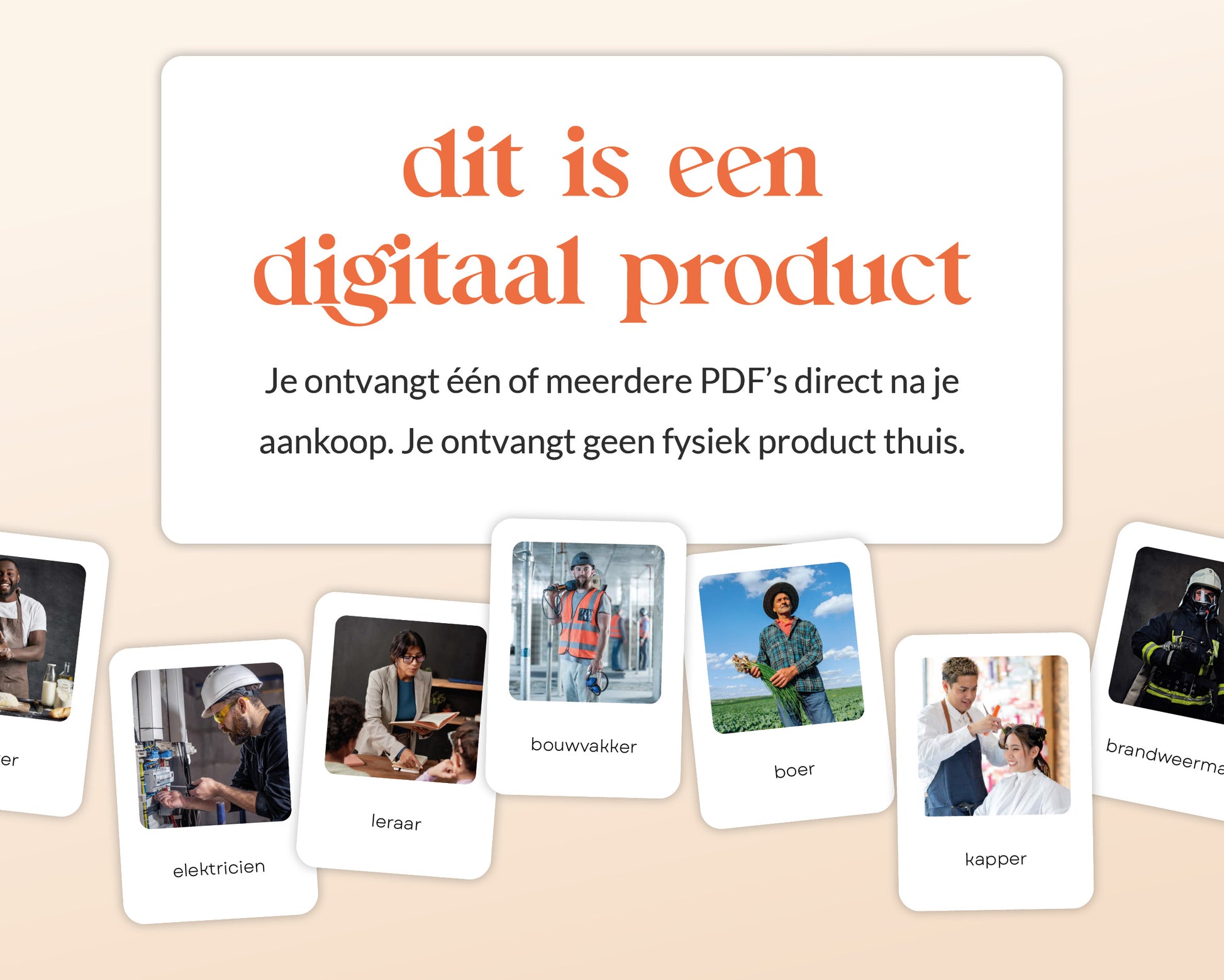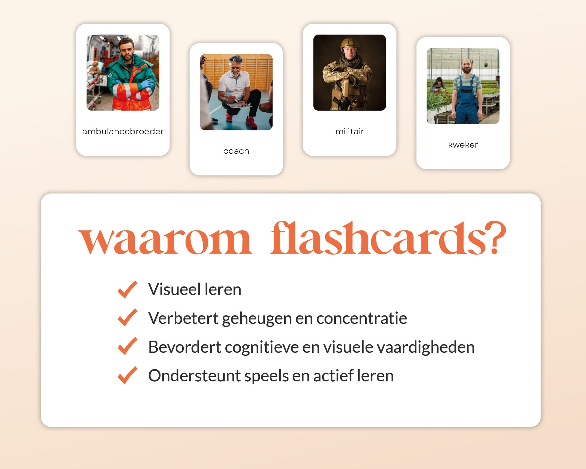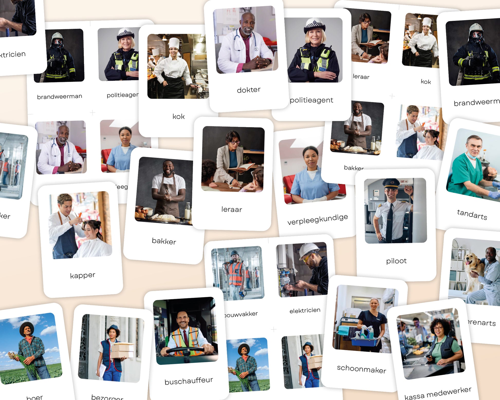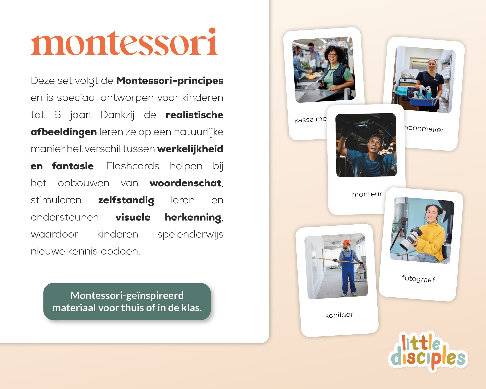 Montessori flashcards kunnen vanaf ongeveer 14 maanden worden geïntroduceerd. Op deze leeftijd beginnen kinderen hun vocabulaire op te bouwen en kunnen ze eenvoudige kaarten herkennen met één afbeelding en woord. Naarmate ze ouder worden, ondersteunen deze kaarten de verdere ontwikkeling van taal, herkenningsvaardigheden en een vroeg begrip van verschillende beroepen. De flashcards blijven waardevol tot ongeveer 6 jaar, perfect afgestemd op de nieuwsgierigheid en ontwikkelingsbehoeften van kinderen in deze fase.