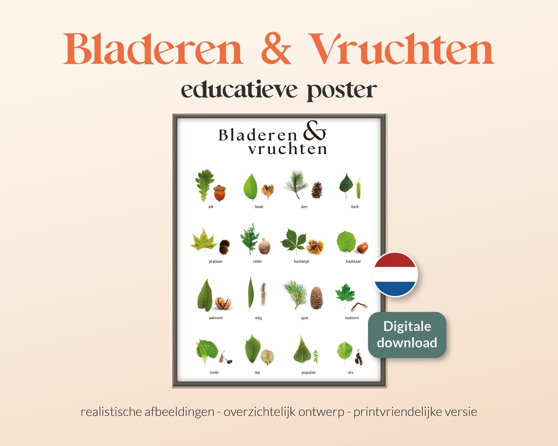 Deze mooie poster met Bladeren en Vruchten is speciaal ontworpen als Montessori-lesmateriaal en perfect voor thuisonderwijs. Kinderen leren spelenderwijs bladeren te herkennen en ontdekken wat er allemaal in onze bossen te vinden is. Een leuke en leerzame aanvulling voor thuis, in de klas of de Montessori-omgeving!