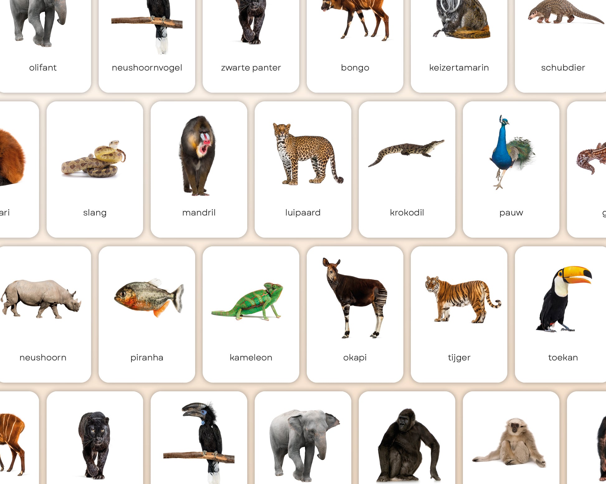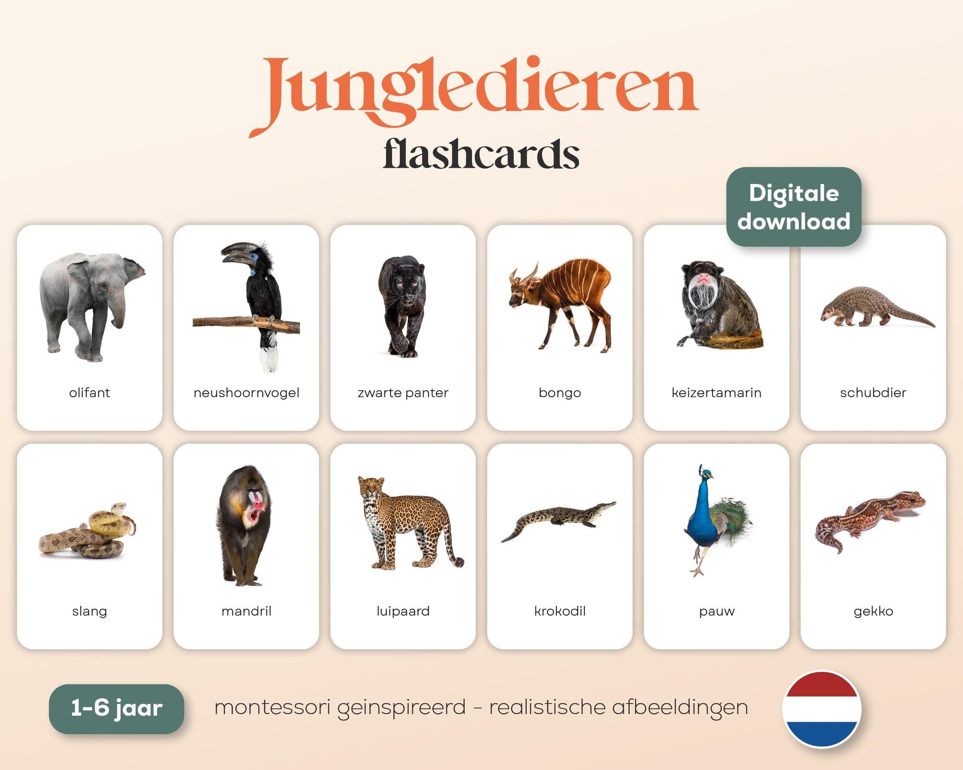Met deze set jungledieren flashcards leren kinderen spelenderwijs verschillende dieren uit de jungle herkennen en bouwen ze een sterke basis in dierherkenning en woordenschat op. Een leuke en educatieve manier om hun ontwikkeling te ondersteunen!