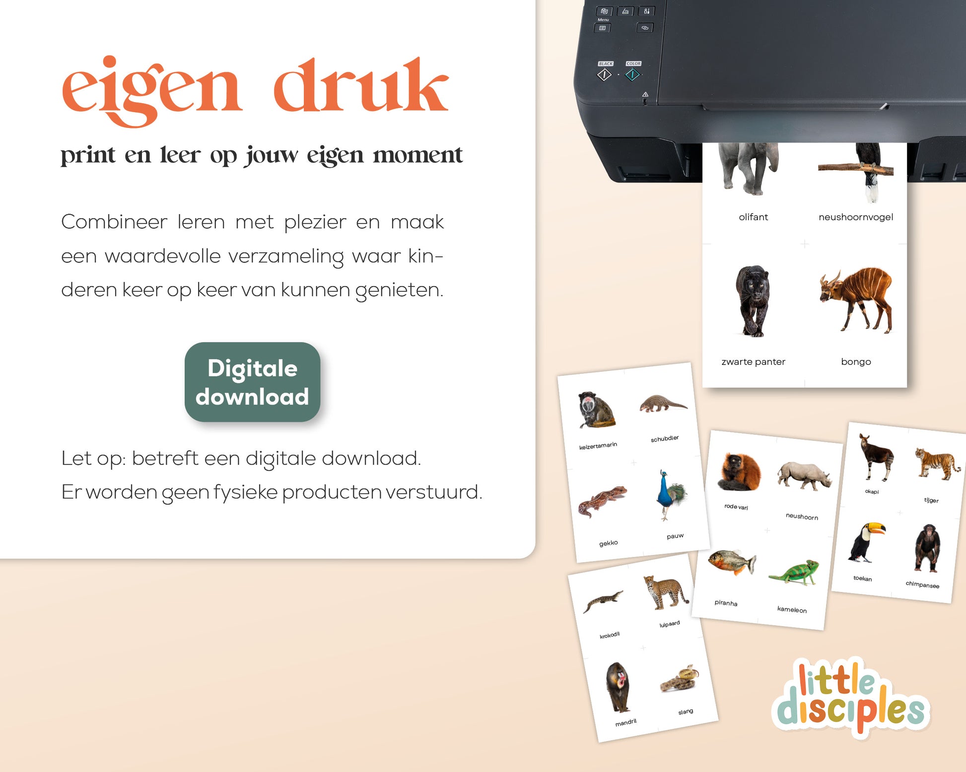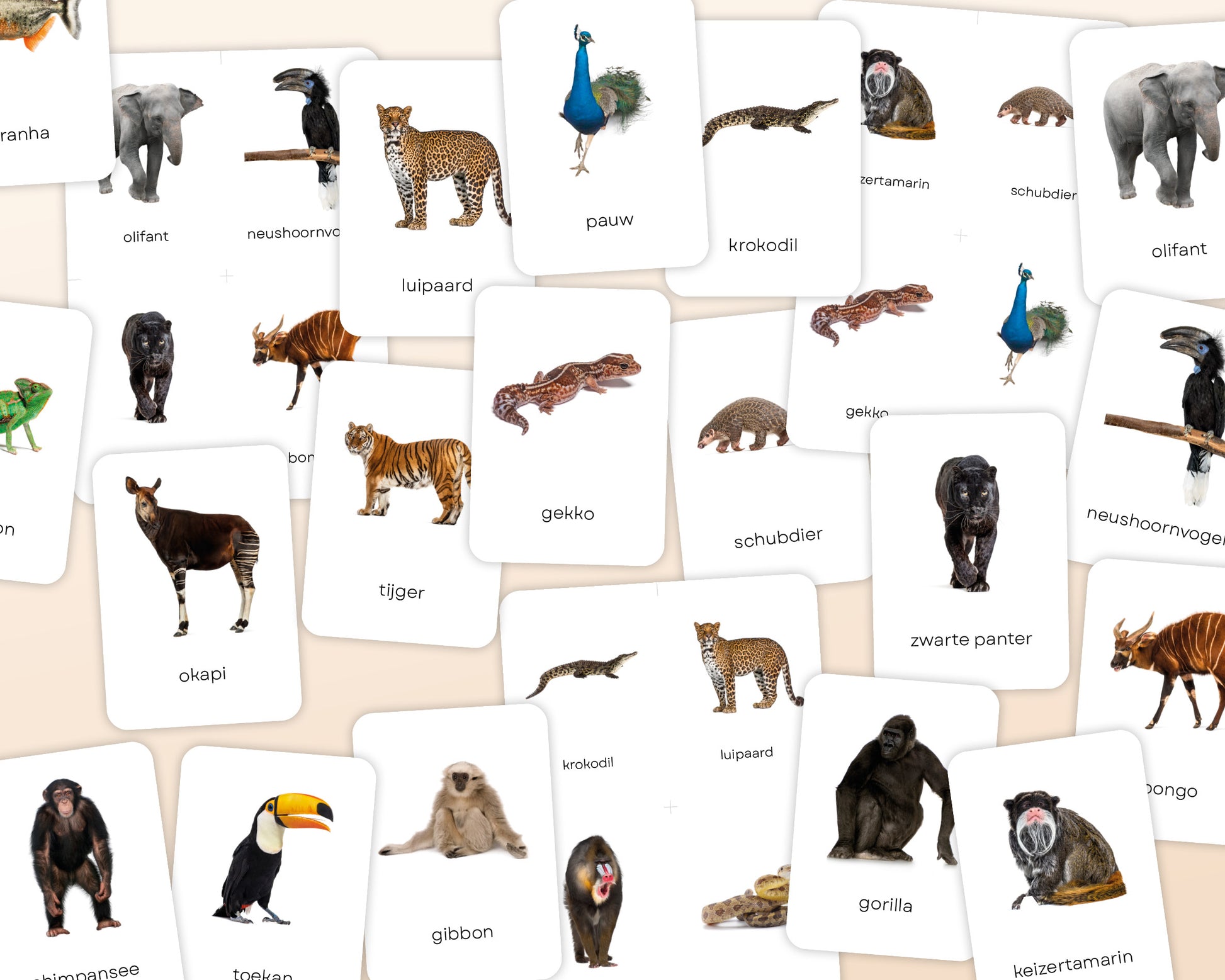 Deze Montessori-geïnspireerde set met realistische jungledierfoto's is speciaal ontworpen voor kinderen tot 6 jaar, die nog moeite hebben met het onderscheiden van realiteit en fantasie. Door echte foto's te gebruiken in plaats van tekeningen, krijgen kinderen een duidelijk beeld van hoe jungledieren er in het echt uitzien. Dit stimuleert hun natuurlijke nieuwsgierigheid en helpt hen de jungle en zijn dieren beter te begrijpen, volledig in lijn met de Montessori-methode.
