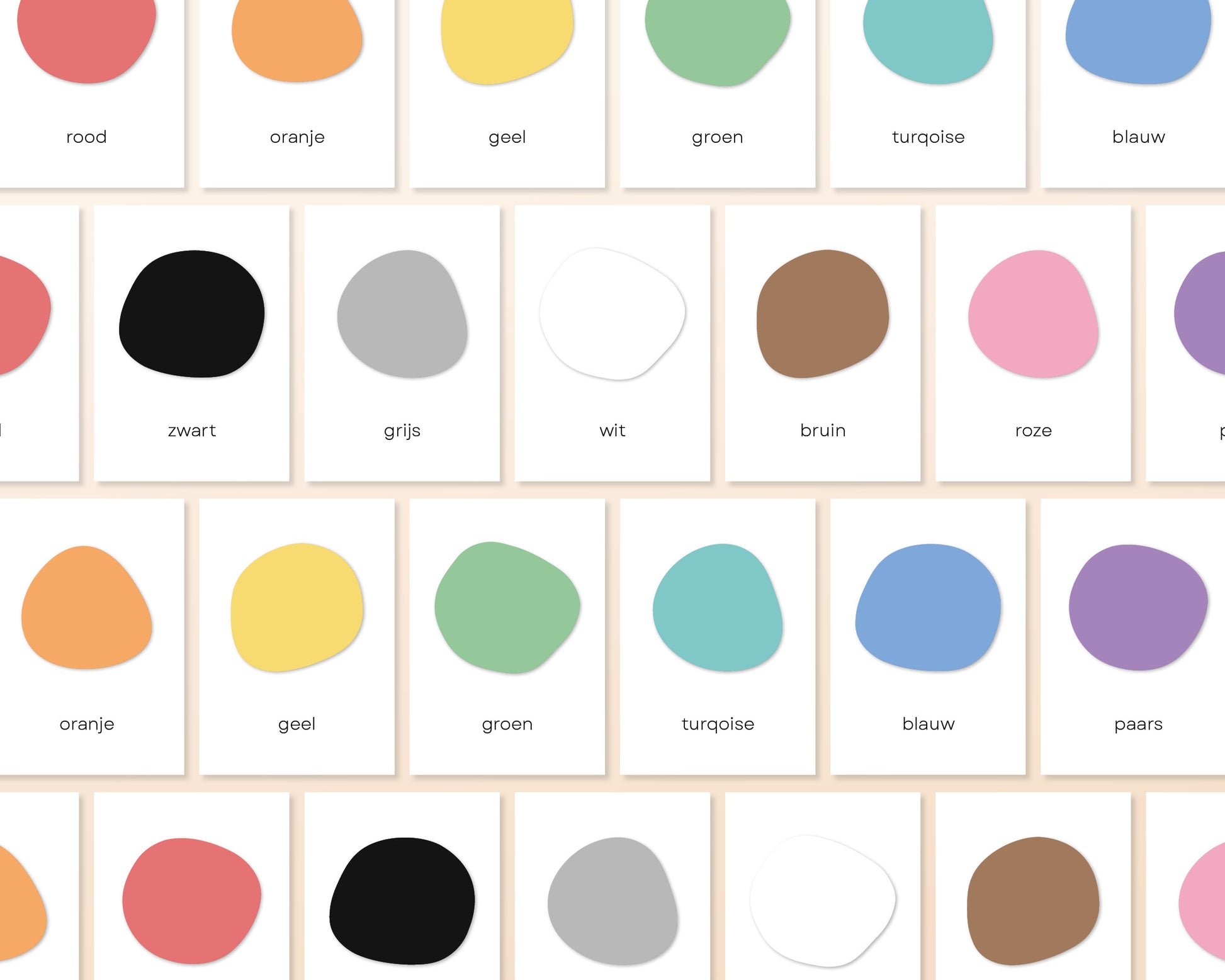 Je ontvangt een digitaal PDF-bestand met vier A6-kaarten per A4-pagina. Knip de kaarten langs de snijlijnen en lamineer ze eventueel voor extra duurzaamheid. Ideaal voor individuele activiteiten, matching-spellen of creatieve spelmomenten!