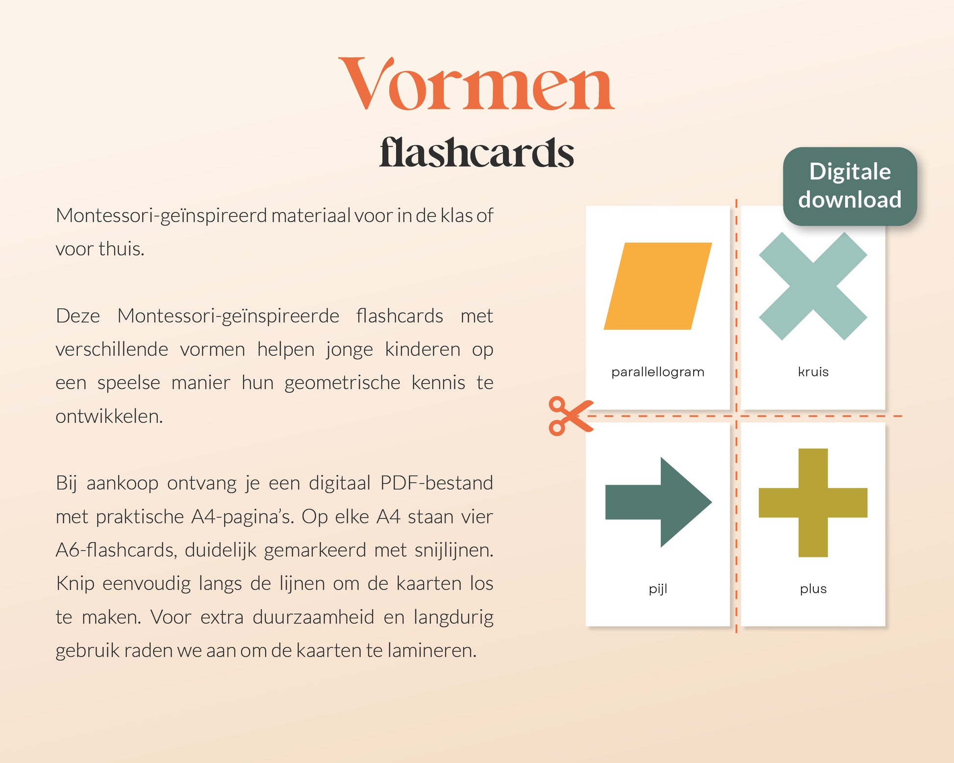 Je ontvangt een digitaal PDF-bestand met vier A6-kaarten per A4-pagina. Knip de kaarten langs de snijlijnen en lamineer ze eventueel voor extra duurzaamheid. Ideaal voor individuele activiteiten, matching-spellen of creatieve spelmomenten!