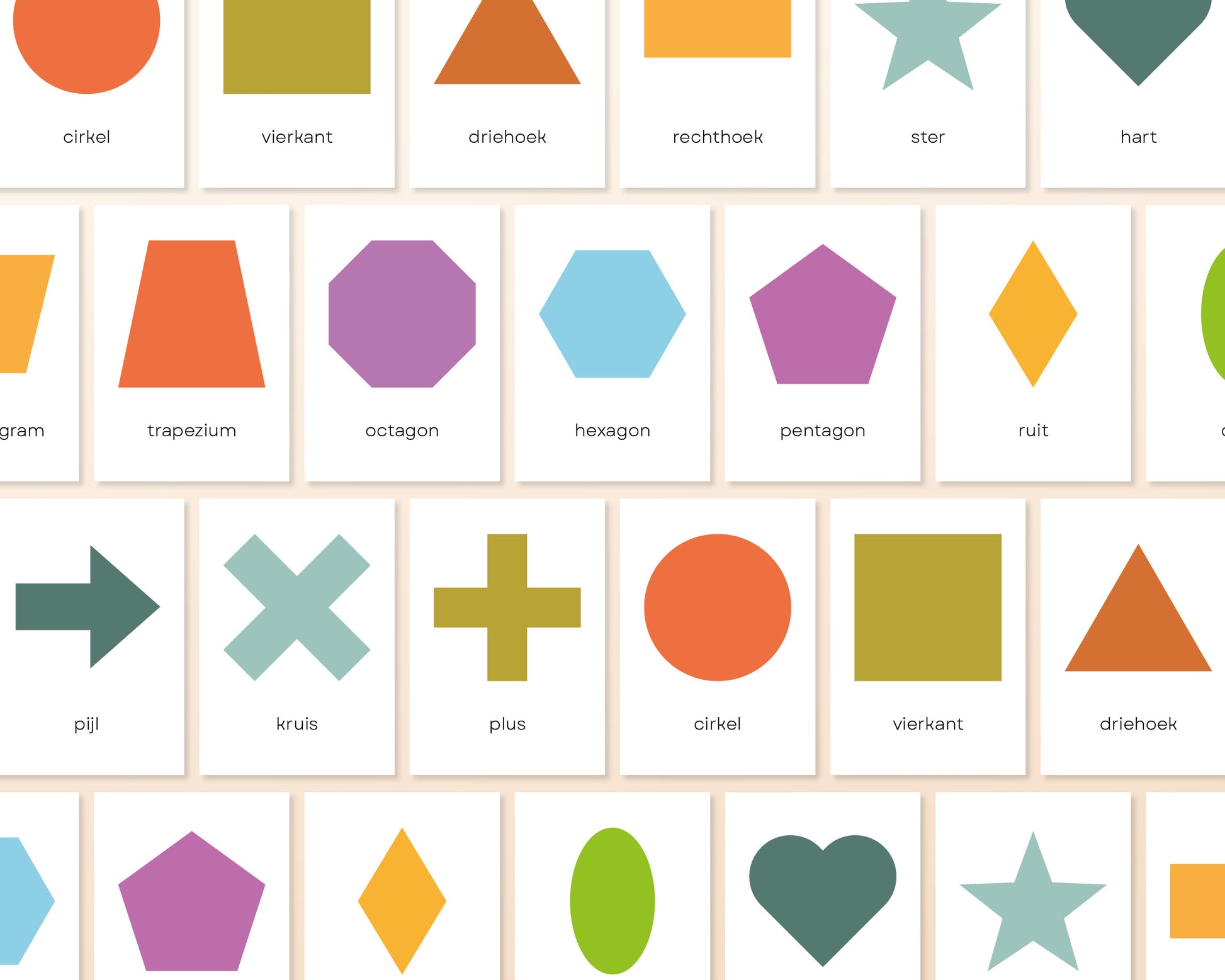 Deze Montessori-geïnspireerde flashcards met verschillende vormen helpen jonge kinderen op een speelse manier hun geometrische kennis te ontwikkelen. Met duidelijke afbeeldingen leren kinderen de namen van veelvoorkomende vormen zoals cirkels, vierkanten, driehoeken en nog veel meer. Dit versterkt hun begrip van ruimte, structuur en visuele waarneming.